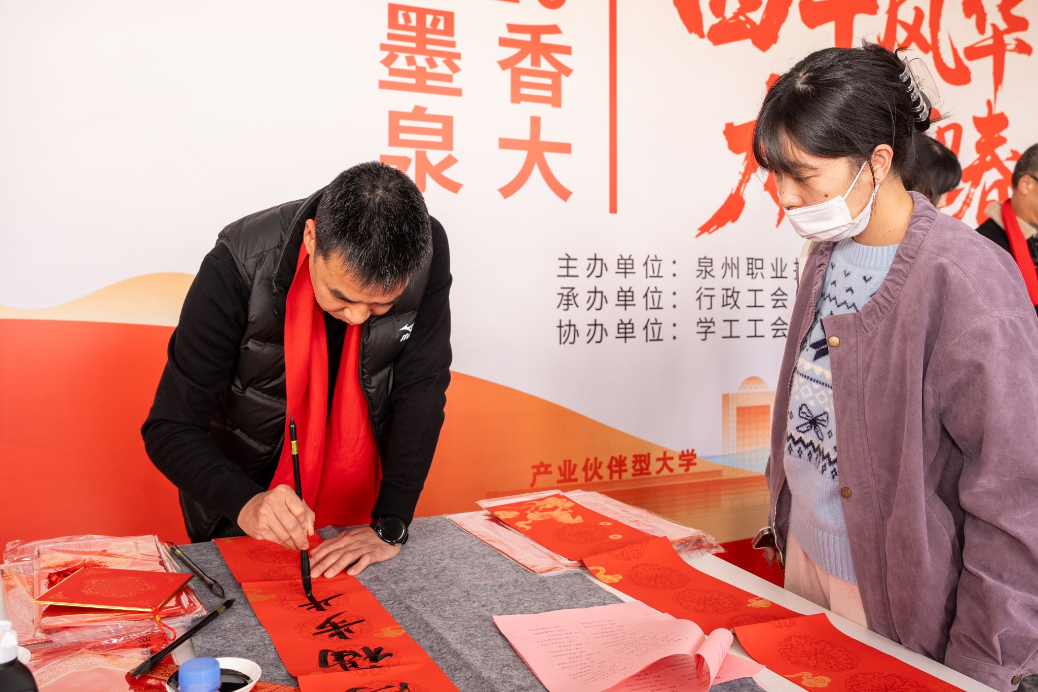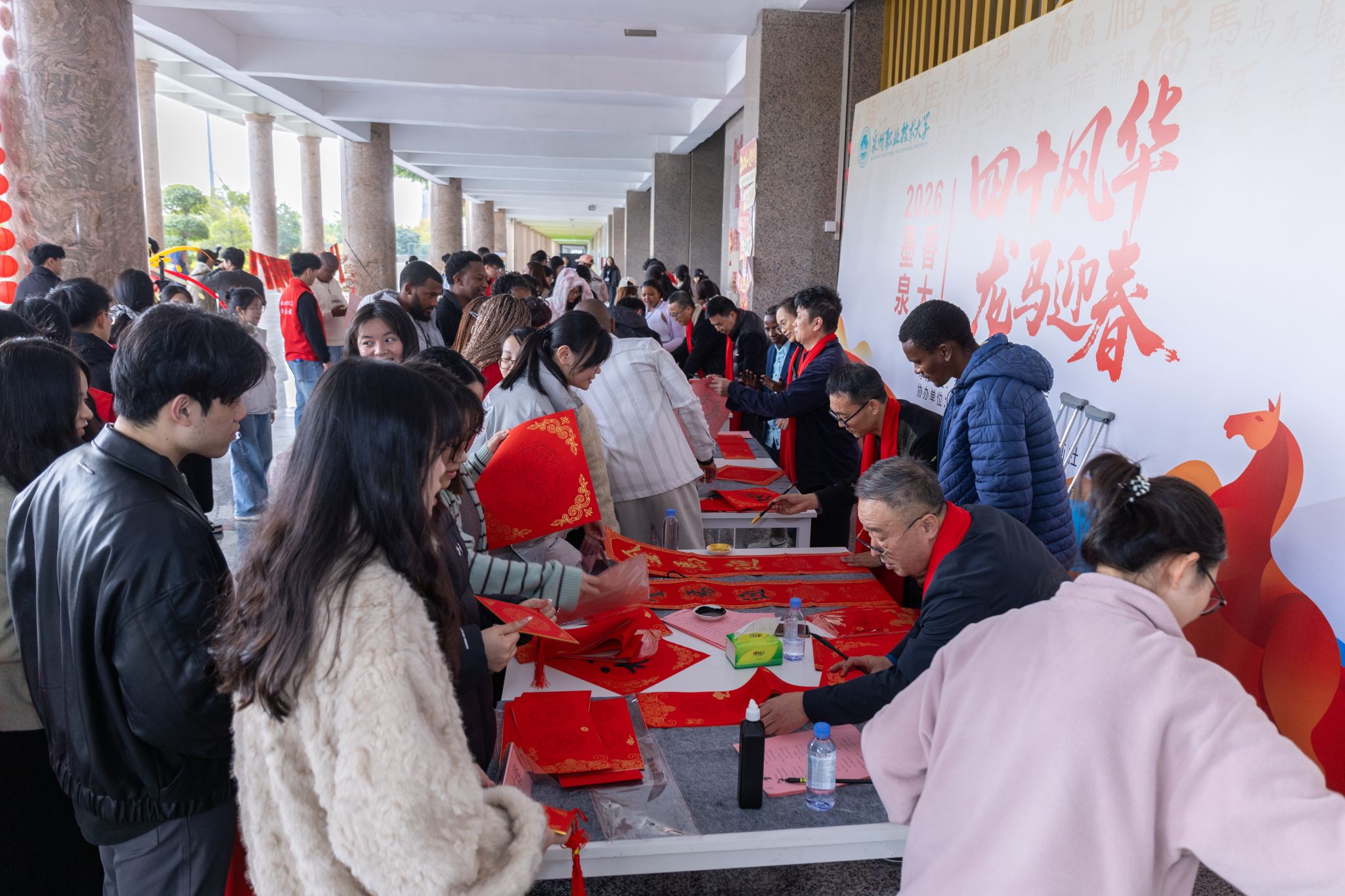 1月16日,泉州职业技术大学行政主楼一楼平台暖意融融,一场以“四十风华 龙马迎春”为主题的写春联送祝福活动正在这里举行。本次活动由学校工会主办,行政工会承办,学工工会、教研工会、书画社共同协办,师生共同参与。书法家们提笔挥毫,一撇一捺之间,将新春祝福融入一张张联纸上,为大家献上一副副吉祥喜庆的春联。