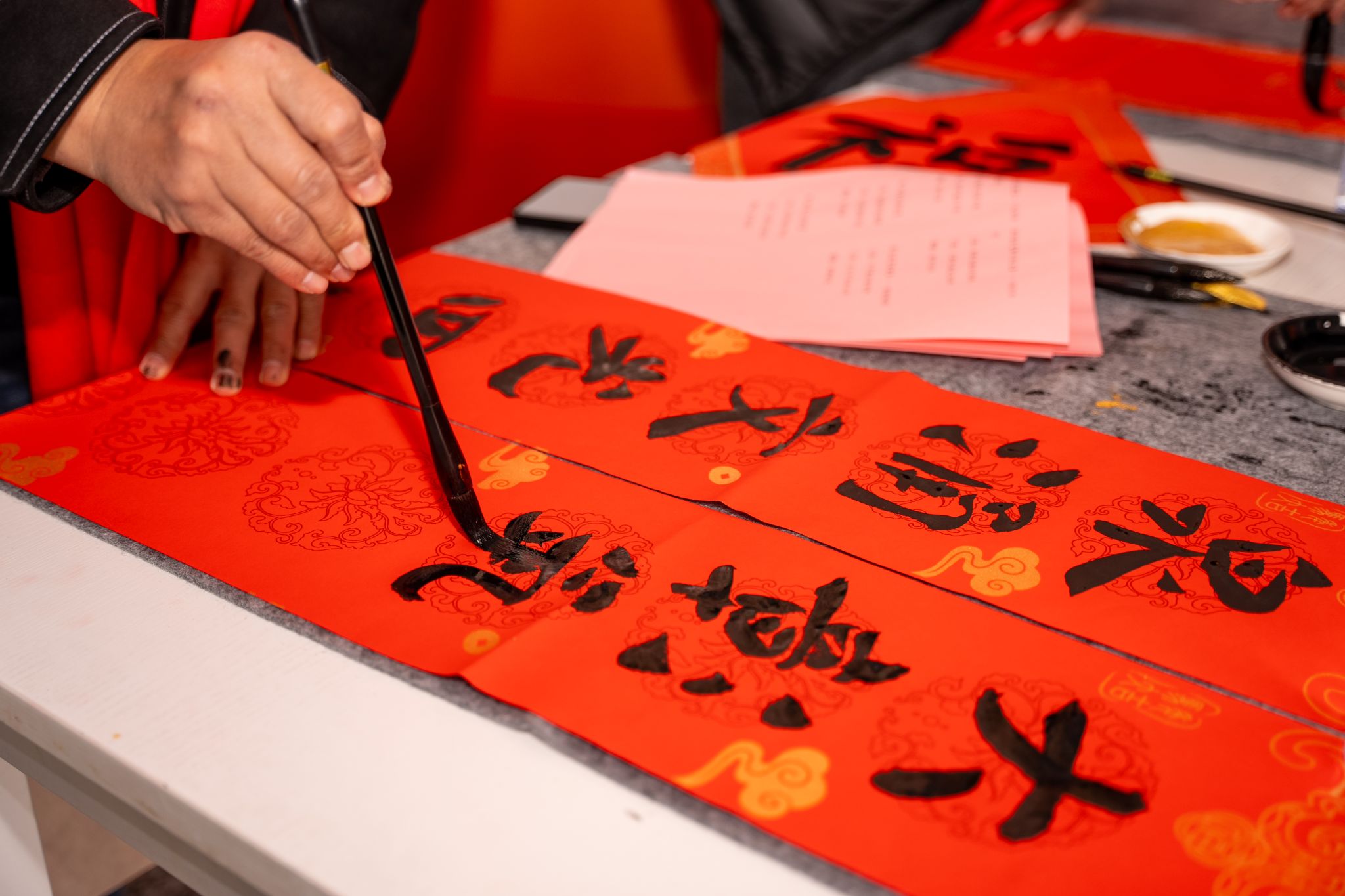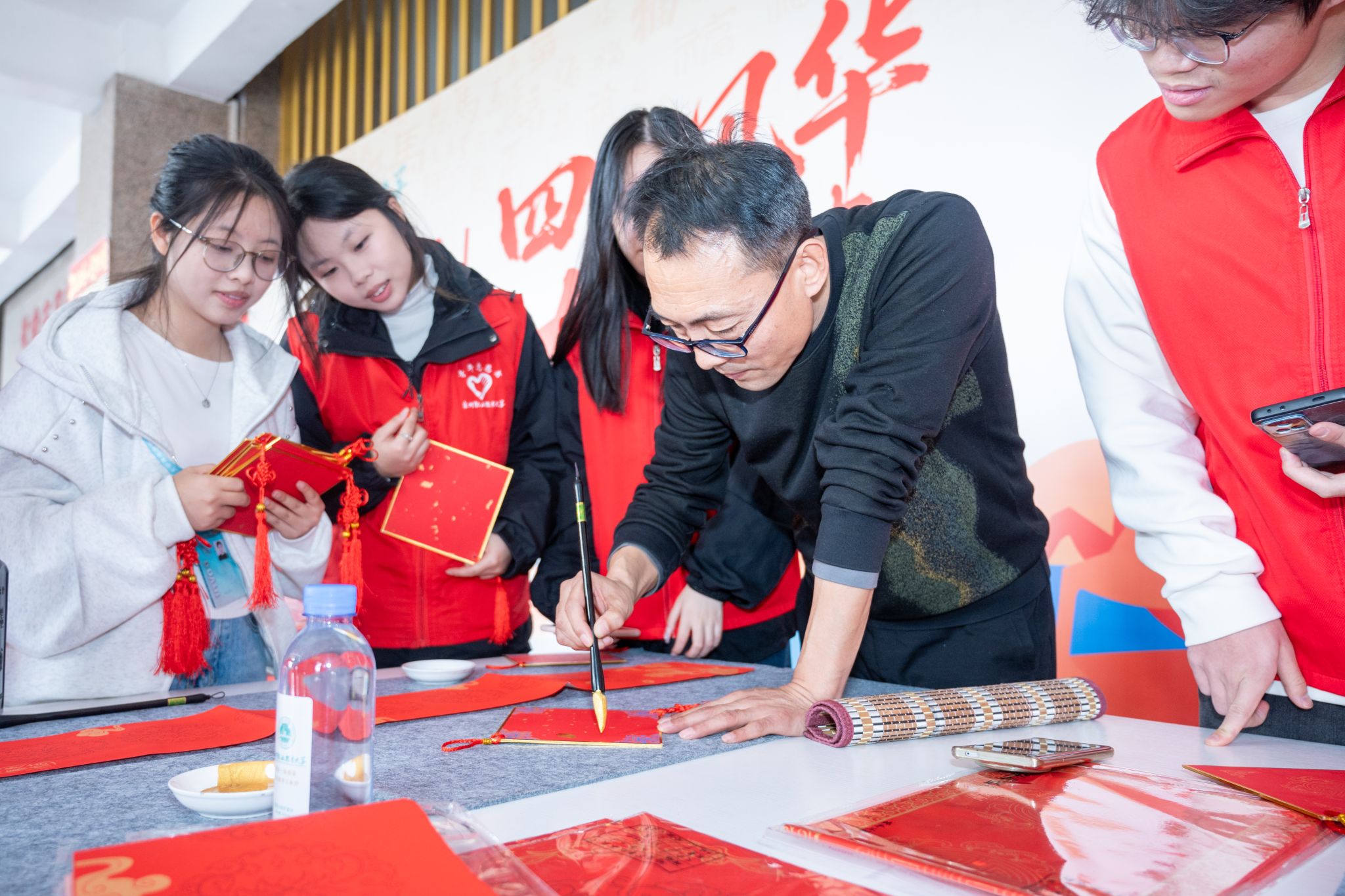 活动现场不仅提供数百副传统春联供师生选取,更设有书写体验区,与教育学院设的金马拓印体验。王树锋、关瑞明、陈力、刘选金、洪昆炼、洪春锦等6位老师,和书画社石家乐、江心韵、朱东平、谢思扬等4位学生一同挥毫,志愿者协助铺纸、晾联,秩序井然。一副副春联、一个个“福”字,很快被领取一空,带着温度挂往宿舍、办公室,扮靓校园年味。