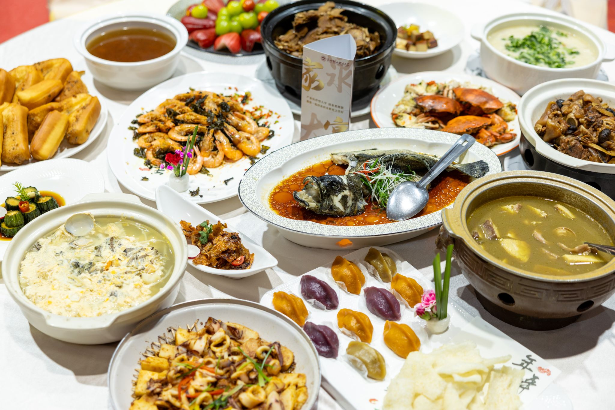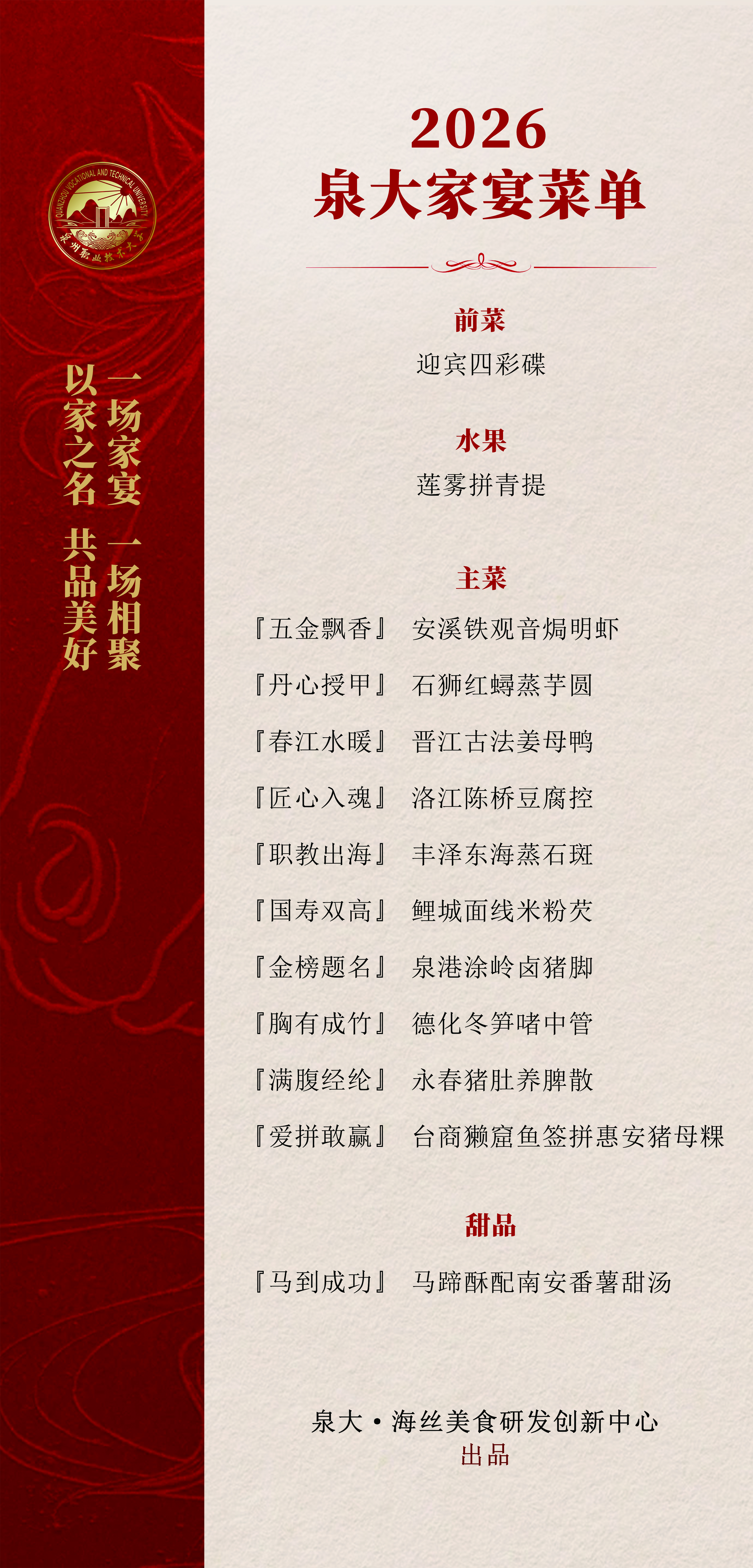 1月20日,在泉州职业技术大学的新春家宴上,泉大·海丝美食研发创新中心结合泉州各县(市、区)的特色美食,特别为家人们推出泉州风味、融入职教元素与闽南精神的菜肴。