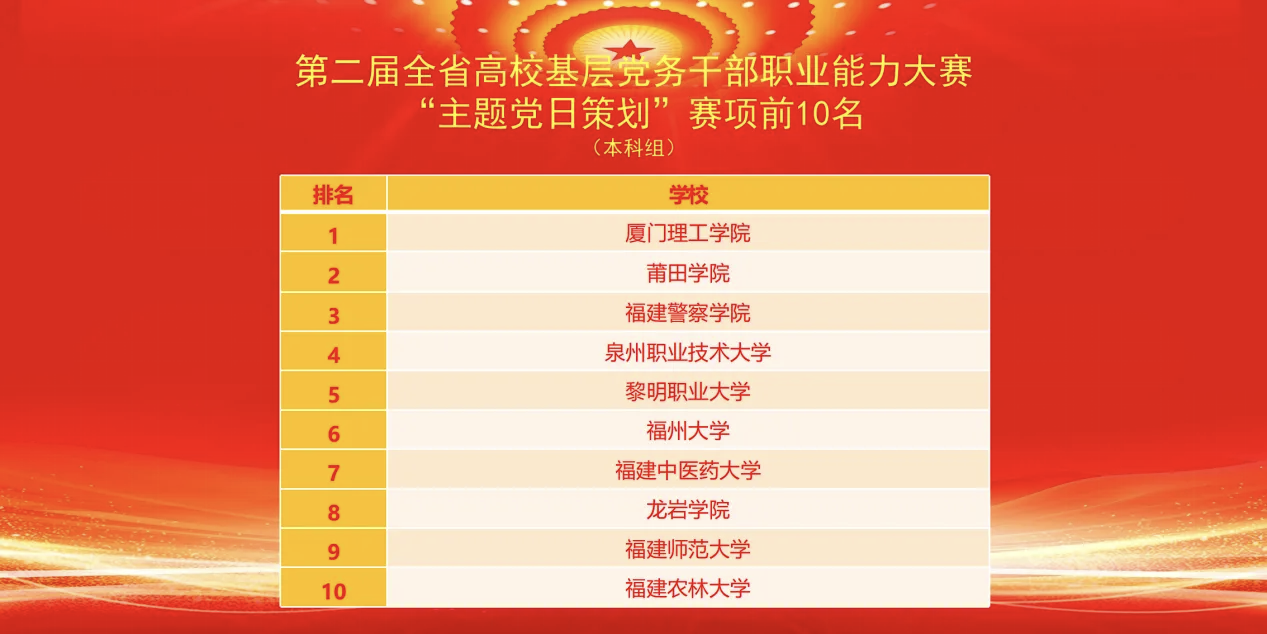 11月28日,由福建省委教育工委主办的第二届全省高校基层党务干部职业能力大赛在福建师范大学落下帷幕。我校团队参赛项目从全省40余所本科院校中脱颖而出,获得“主题党日策划”赛项单项奖第4名,入围表彰行列,系本届大赛中全省同类院校唯一入榜单位。
