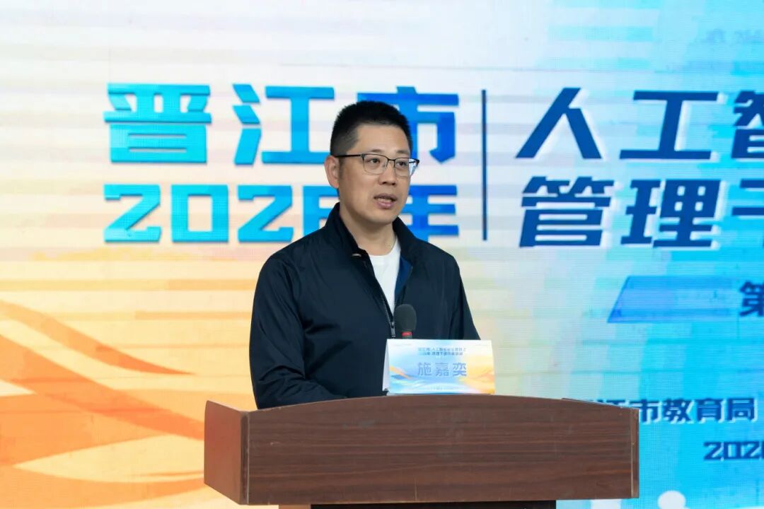 晋江市教育局党组书记、局长,晋江市教师进修学校校长施嘉奕出席开班仪式并讲话。他指出,本次培训是晋江推进数智赋能教育十项举措的重要内容,全市教育系统要锚定“数智赋能,通识筑基”方向,围绕校长、教师、学生“3个100%”目标,确保年内实现人工智能通识培训全覆盖。他强调,以人工智能为代表的新一代信息技术正加速突破与应用,已成为推动高质量发展的关键引擎,全市教育系统必须主动顺应这一趋势,既要把握其理论与历史脉络,更要掌握技术与实操要义,全面布局“数智+”应用场景,为晋江基础教育高质量发展提供有力支撑。他要求市教育局和教师进修学校先行一步、示范在前,带动全市教育系统紧跟时代步伐、加快转型发展。
