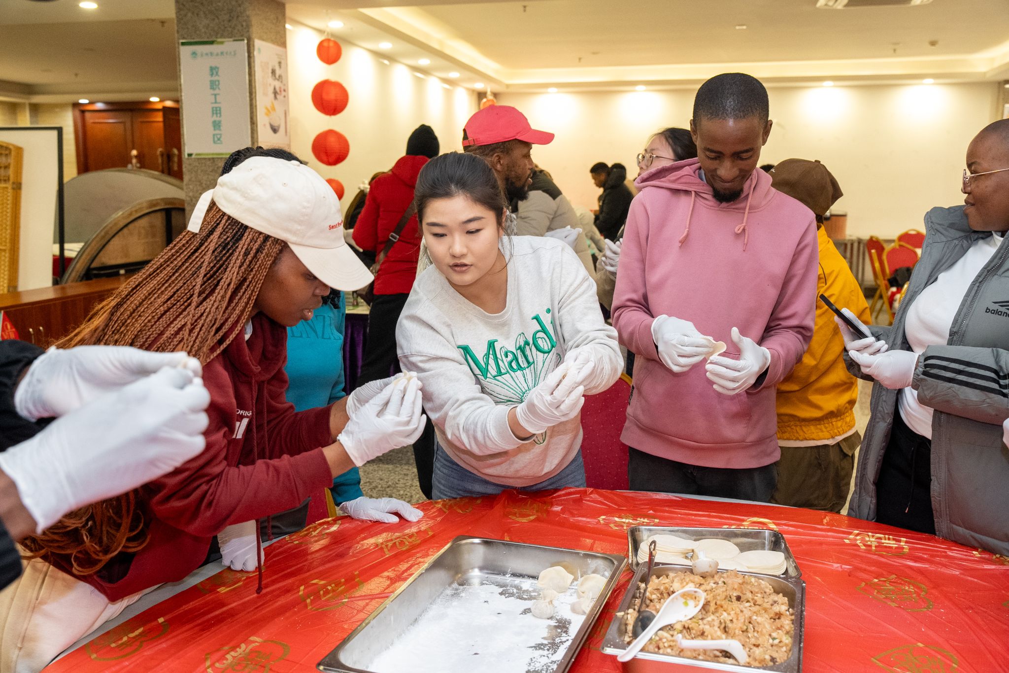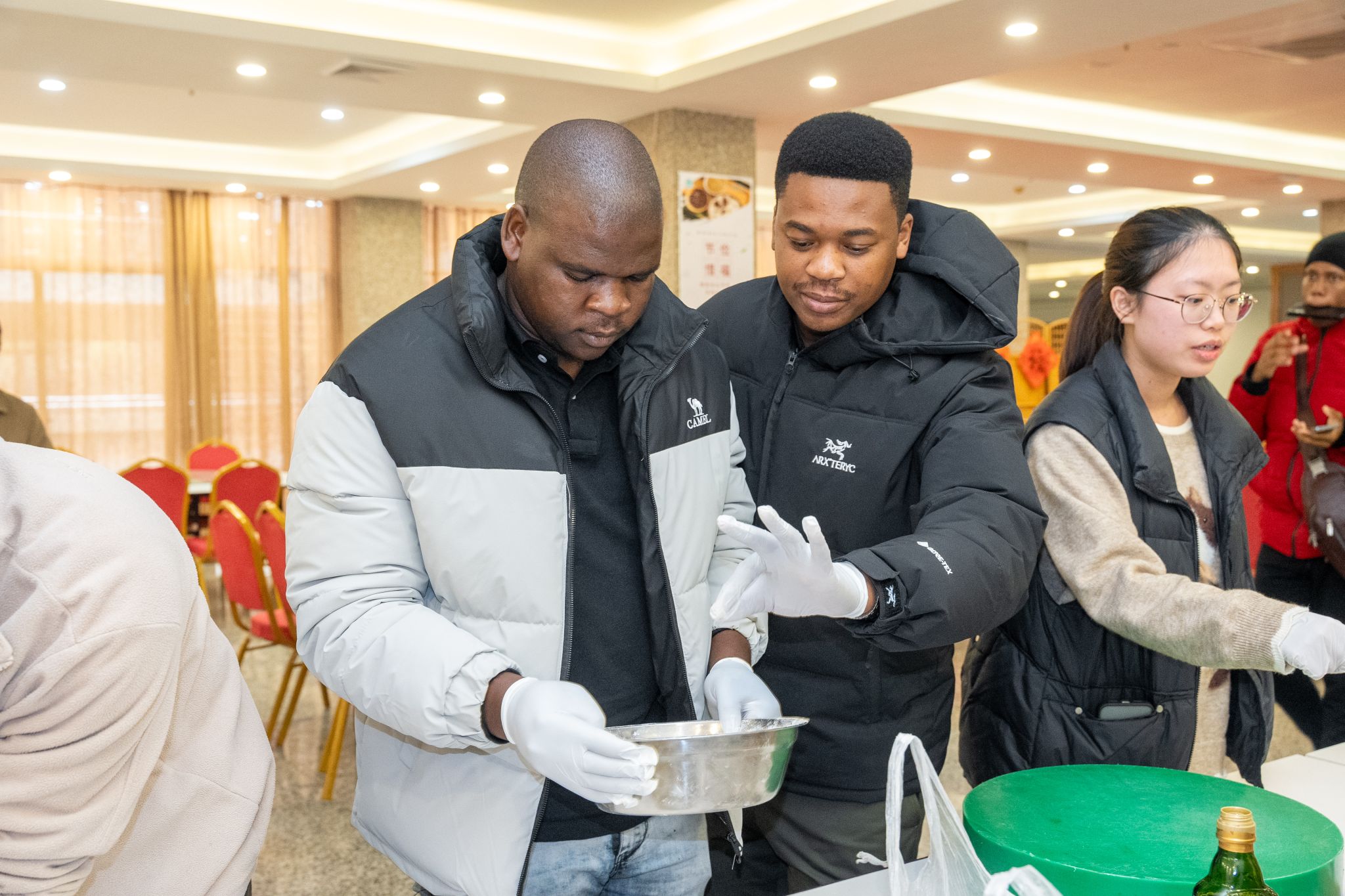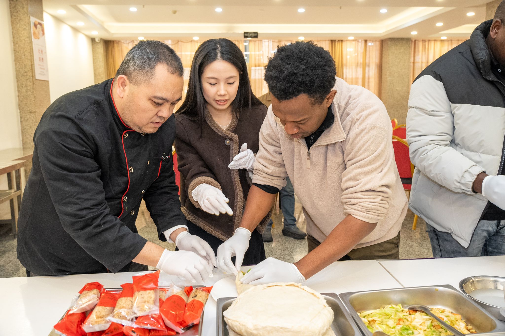 2月3日,正值闽南传统“尾牙”,泉州职业技术大学国际餐厅里热气蒸腾,墙上挂着一对对美好寓意的春联。29位南非跨境电商技能专训班的青年学员围坐一堂,和学校师生一起摊面皮、包饺子、滚元宵圆、卷润饼,提前体验浓郁的中国年味。