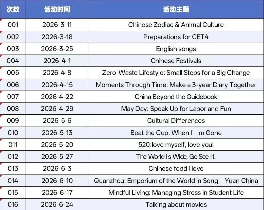 英语角由教育学院国际语言中心与英语协会联合主办,面向对英语交流有兴趣、具备一定基础并希望提升口语表达的同学。活动旨在营造寓学于乐的英语学习氛围,有效提升英语爱好者的交际能力。每期英语角将发布活动海报,介绍当期主题、内容及报名方式。活动以真实交流为主,鼓励大家大胆开口、积极参与讨论。