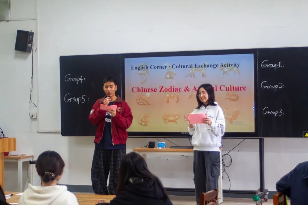 这学期,第二课堂的英语角,被设计成常态化语言实践项目。一学期有16期活动,每周举办一次充满互动性的主题活动,有“十二生肖与动物文化”“英文歌曲畅谈”“中国传统节日”等。同时,还有破冰问答、文化交流、团队游戏等环节,让同学们在交流与游戏中说英语。刘颐琳开心地说,“英语角就是一个练兵场,让同学们在真实交流中用上英语、爱上英语!”