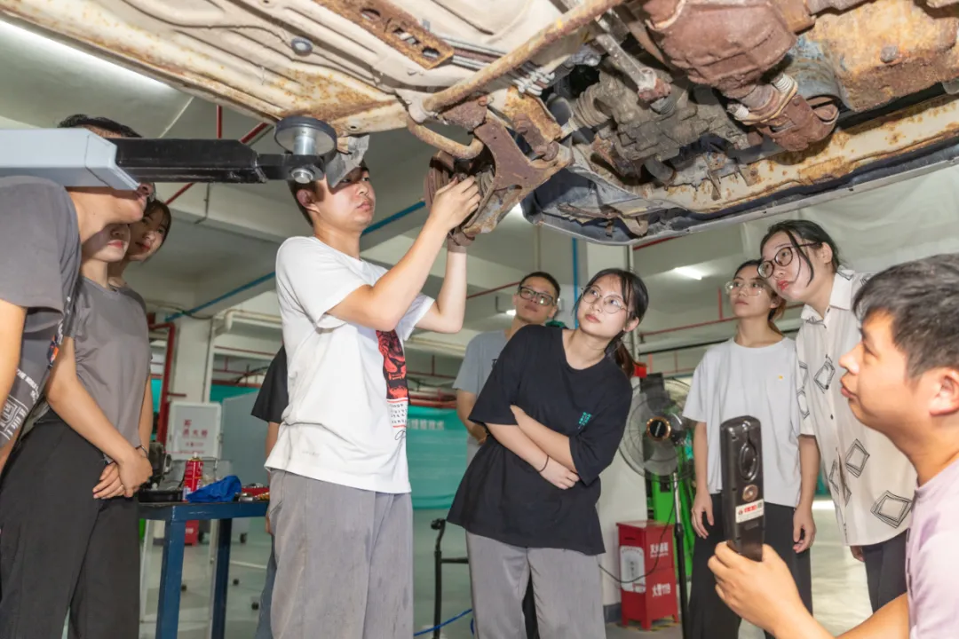 同样,为了激发学生兴趣,中营汽车学院的“开学第一课”,让学生们来到汽车工程中心。这里是一个汽车维护保养综合实践基地,从汽车检测、维修、保养、销售……全流程应有尽有。赖景湖、郑培森、黄绍金三位老师,分别带着一组学生开展汽车维护保养实践,老师们先讲解各种关键技术技能要点,并当场给大家示范。然后,他们让学生们一一动手,操作中的每个细节老师都紧盯,一有问题立马提醒学生改正,大家反复训练,直到每个人都掌握。
