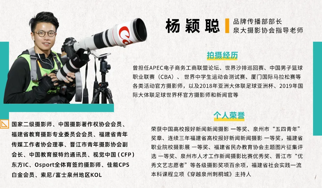 杨颖聪老师和邓皓予老师,俩人都自小是摄影迷。他们常带学生去采风,拍摄泉州故事、捕捉福建风光、聚焦美丽中国。师生们一次次探寻不一样的风景,给他们意想不到的收获。