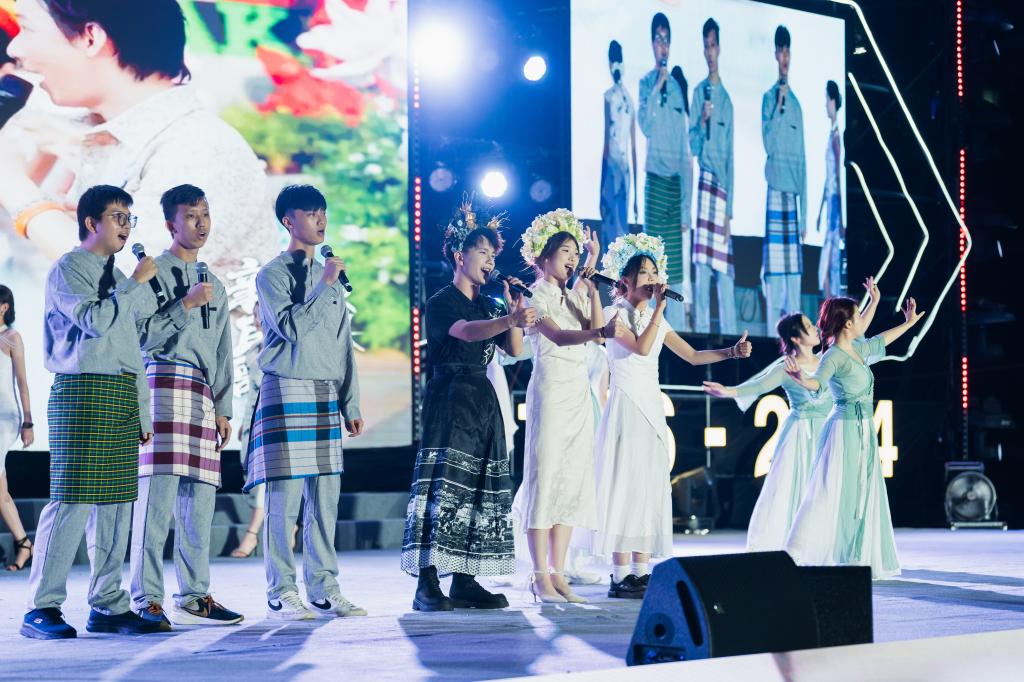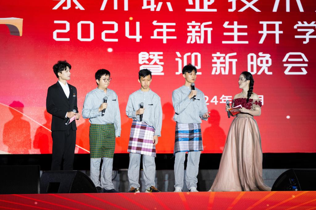 ▲ 来自马来西亚的留学生魏俊恩、许优杰、田展行,在新生开学典礼暨迎新晚会上,近距离感受中华传统文化的独特魅力,与其他泉大学子共同带来一场精彩演出