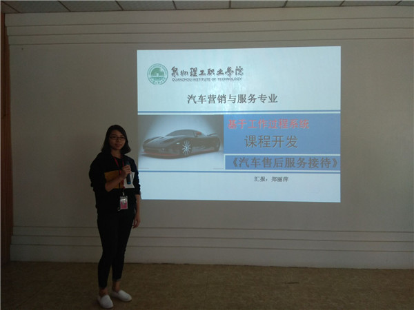 转训分享会首先由郑丽萍老师主讲,讲授的是《汽车售后服务接待》这门课程改革过程。通过PPT展示内容分析、岗位分析、角色扮演、资源库的应用、课程建设等方面。可以看出从传统模式课程到通过改革后的基于工作化系统课程的变化,郑老师也提出了在课程改革的过程当中遇到的一些问题,也提供了一些建议。