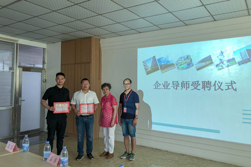 第二项议程,由商学院副院长陈旭兰高级会计师,商学院党总支书记陈荣惠老师为施凯东副总经理、蔡银波团队长颁发泉州理工学院企业导师聘书。