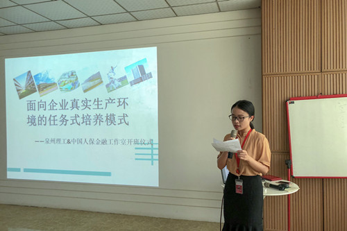 产教融合、校企合作是职业教育的基本办学模式,是办好职业教育的关键所在。为深入贯彻落实党的十九大精神,落实《国务院关于加快发展现代职业教育的决定》要求,完善职业教育和培训体系,深化产教融合、校企合作,根据2018年教育部会同国家发展改革委、工业和信息化部、财政部、人力资源社会保障部、国家税务总局制定了《职业学校校企合作促进办法》的文件精神,我校商学院与中国人民财产保险股份有限公司厦门市分公司共同建立“泉州理工--中国人保金融工作室”,基于“面向企业真实生产环境的任务式培养模式”,共同探索拓宽商科类应用型人才的培养路径,提高商科类应用型人才的培养质量。