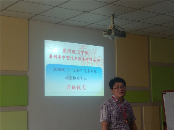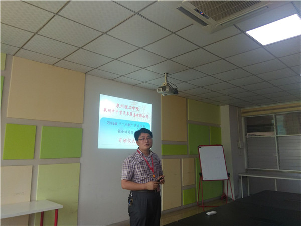 2018年9月16日上午9时,在我校晋江校区主楼二楼第二会议室举行2018级“二元制”汽车专业协同育人开班仪式。出席开班仪式的校领导有泉州理工学院基金会理事长、中营驾校校长杨培琛女士,中营汽车学院汽车检测与维修专业负责人陈明福副教授,中营汽车学院赖城贤、陈金伟、林启豪老师以及“二元制”20位企业新生。开班仪式分为三个流程: