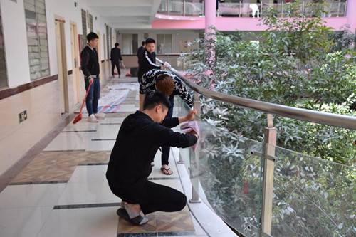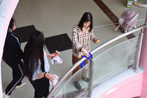 泉州理工学院为美化社区环境,对楼层进行粉刷工作。在工期结束,双馨书院的同学在3月23日中午利用午休时间对双馨书院的走廊、扶手、周边环境以及宿舍卫生进行全面的清洗。太阳光洒在我们的书院粉色的墙体上,书院显得格外温馨!