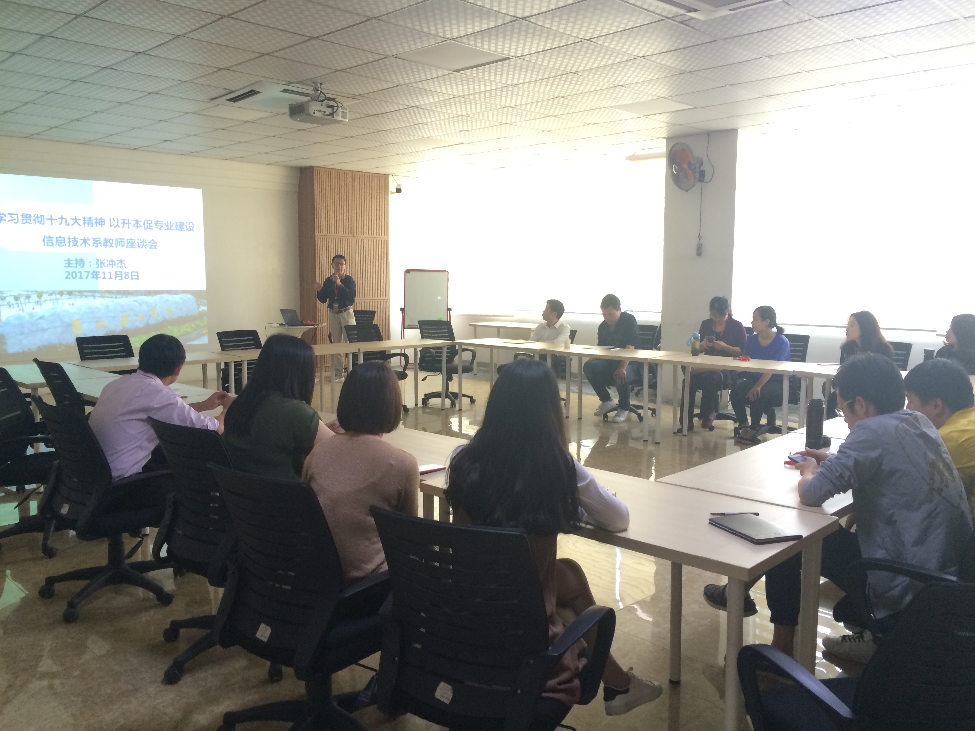 11月8日,信息技术系在主楼第二会议室召开了期中教学检查教师座谈会,围绕“以升本为动力,提升教学质量”的主题进行交流。会议由张冲杰主任主持,系全体教师参加。