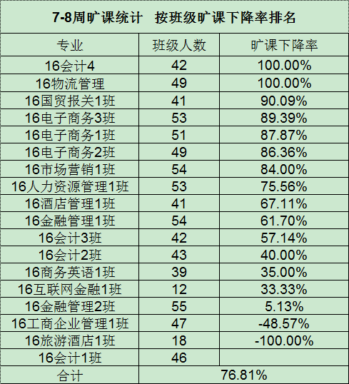 通过学风整顿,本学期开学8周以来,整个学院的学风有所提高,旷课率均有下降,具体