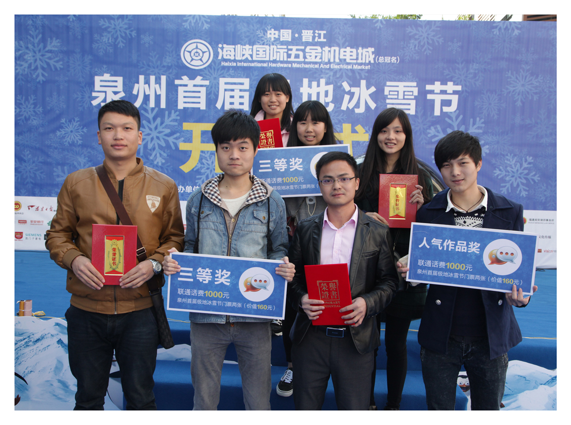 展厅正中间有两块显眼的展板是13环艺专业师生在2014年12月,代表学校参加“海峡两岸(泉州)大学生冰雕创意设计作品大赛”获奖作品,在与各本科和大专院校激烈比赛中脱颖而出喜获佳绩。其中,“腾飞”作品荣获三等奖和十佳人气奖,“永无止境”作品荣获入围奖和十佳人气奖。