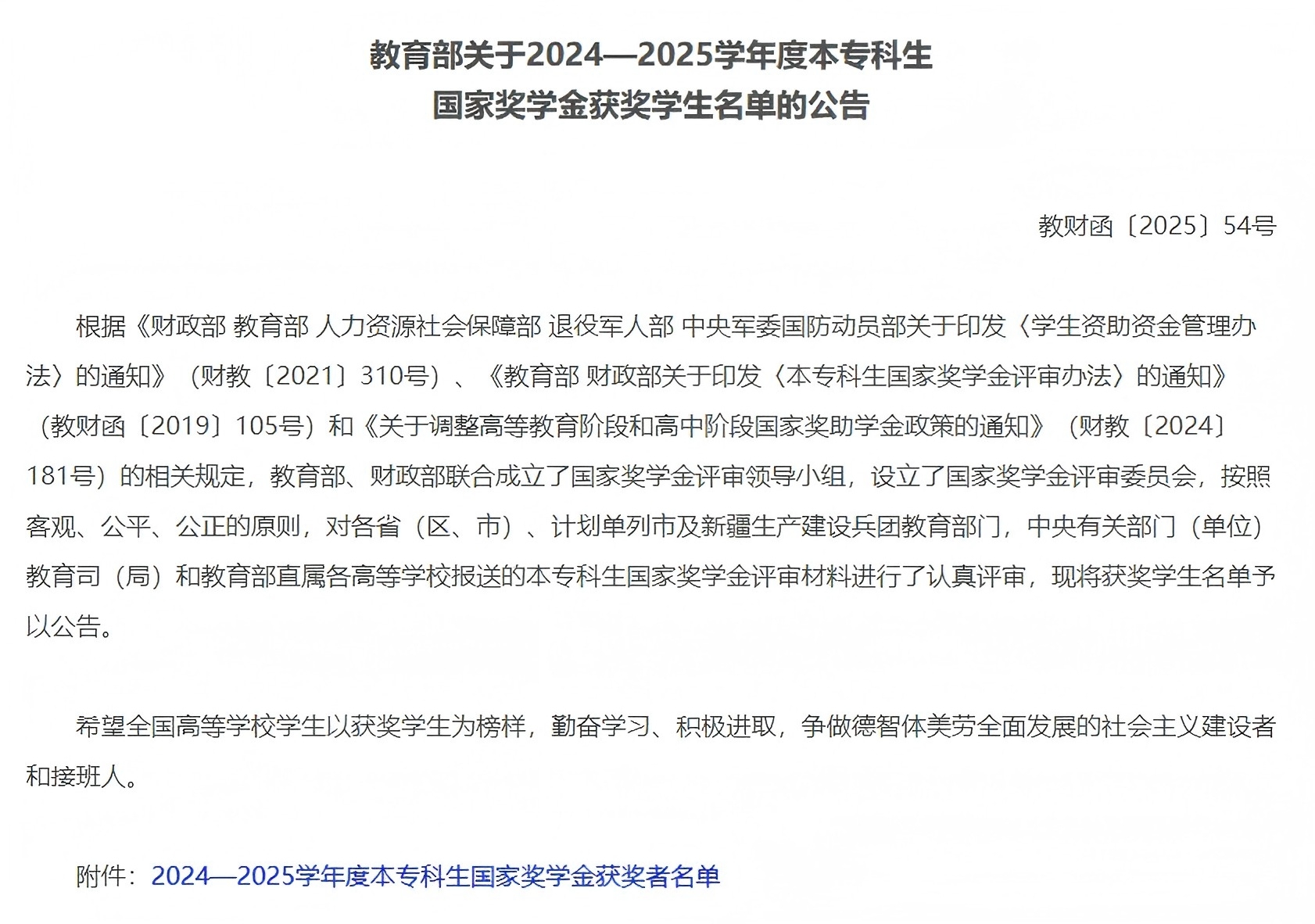 国家奖学金获奖者名单